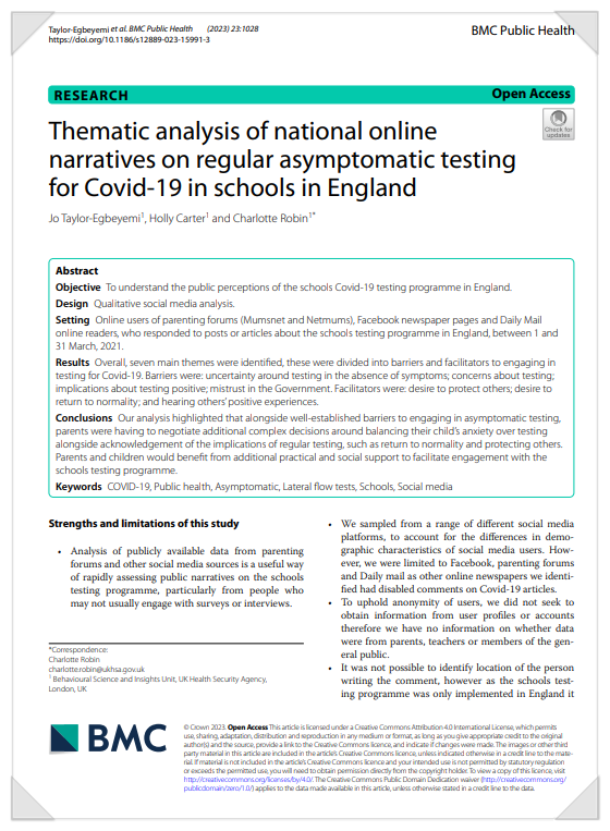 Taylor-Egbeyemi, J., Carter, H., & Robin, C. (2023). Thematic analysis of national online narratives on regular asymptomatic testing for Covid-19 in schools in England. BMC public health, 23(1), 1028.