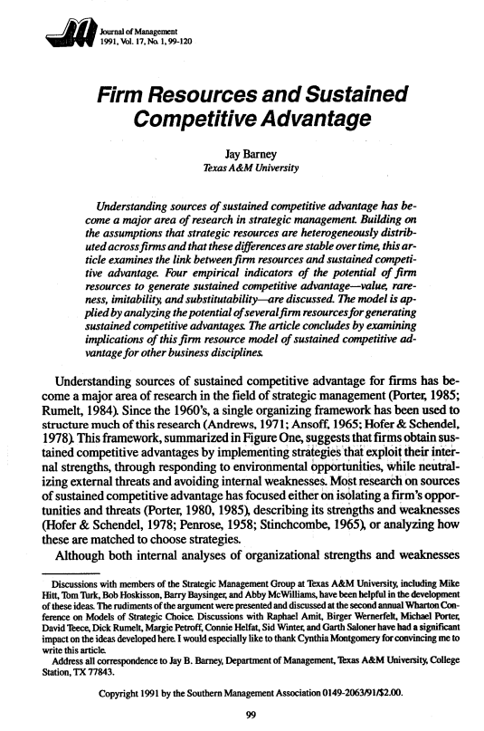 Barney, J. (1991). Firm resources and sustained competitive advantage. Journal of management, 17(1), 99-120.