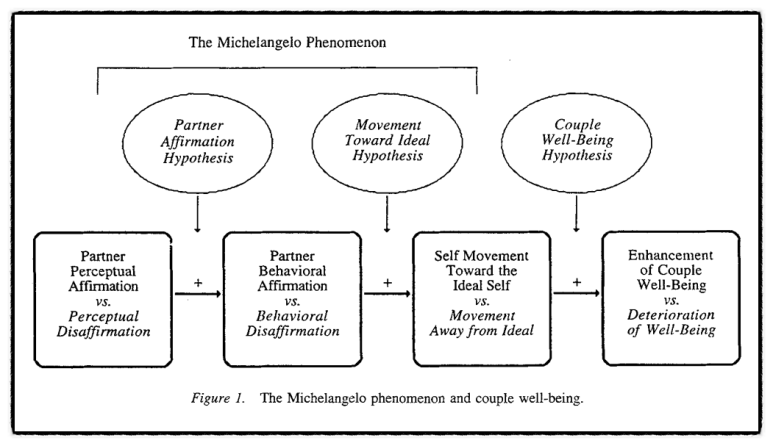 Drigotas, S. M., Rusbult, C. E., Wieselquist, J., & Whitton, S. W. (1999). Close partner as sculptor of the ideal self: behavioral affirmation and the Michelangelo phenomenon. Journal of personality and social psychology, 77(2), 293.
