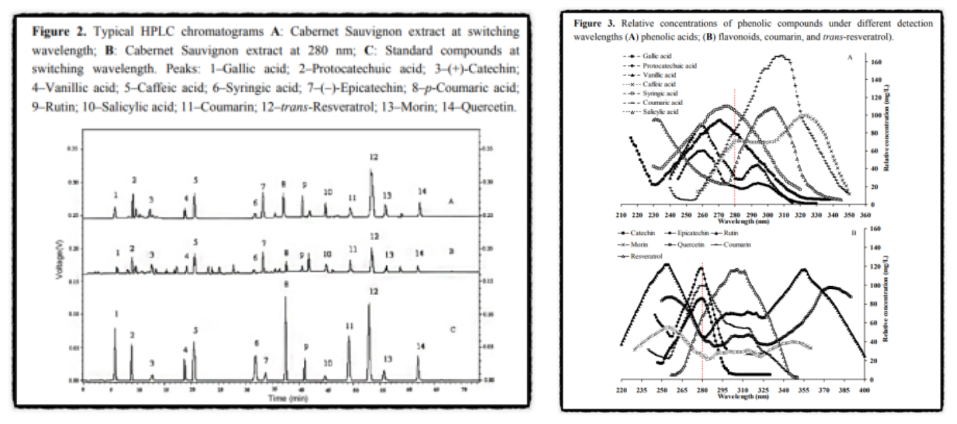 - 페놀 성분마다 흡수 최적 파장이 달라, 파장 전환을 통해 각 성분의 검출 감도 향상