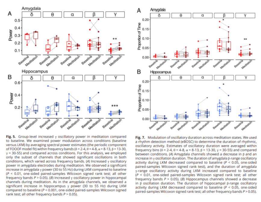 - 명상 중 편도체와 해마 모두에서 감마(γ)파와 베타(β)파가 뚜렷하게 증가했습니다.