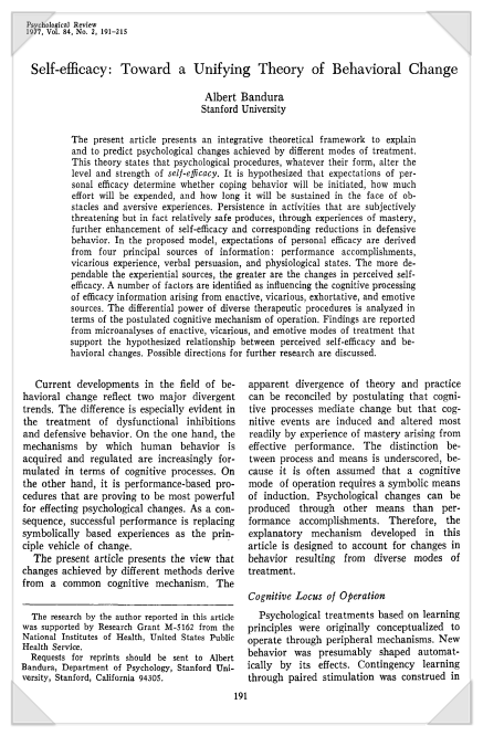 Bandura, A. (1977). Self-efficacy: toward a unifying theory of behavioral change. Psychological review, 84(2), 191.
