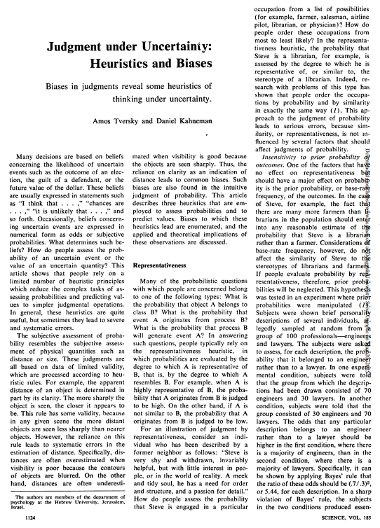 Tversky, A., & Kahneman, D. (1974). Judgment under Uncertainty: Heuristics and Biases: Biases in judgments reveal some heuristics of thinking under uncertainty. science, 185(4157), 1124-1131.