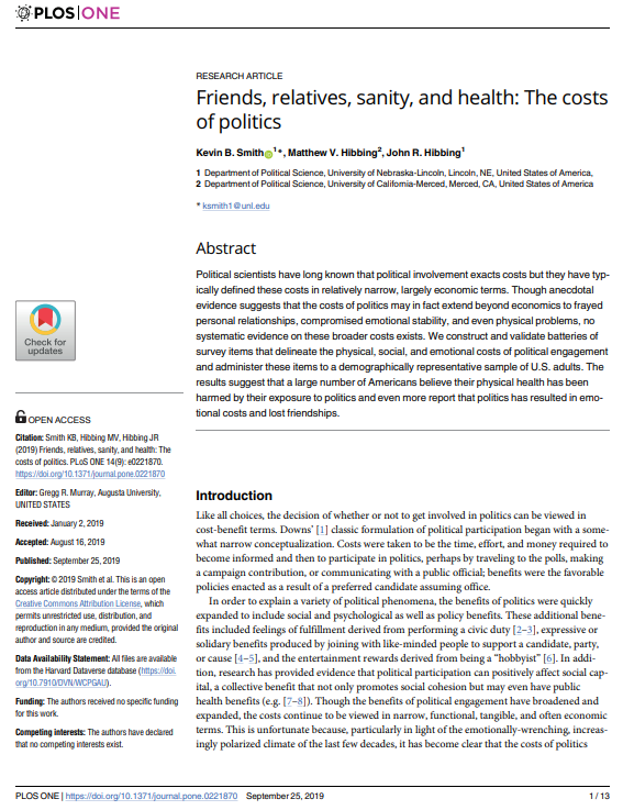 Smith, K. B., Hibbing, M. V., & Hibbing, J. R. (2019). Friends, relatives, sanity, and health: The costs of politics. PloS one, 14(9), e0221870.