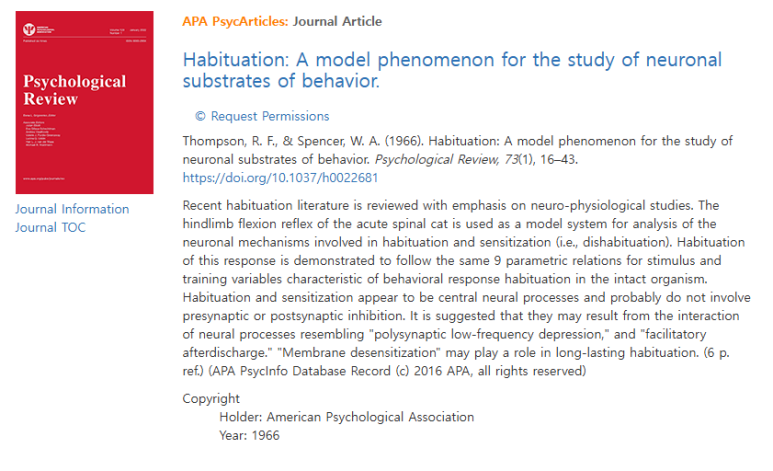 Thompson, R. F., & Spencer, W. A. (1966). Habituation: a model phenomenon for the study of neuronal substrates of behavior. Psychological review, 73(1), 16.