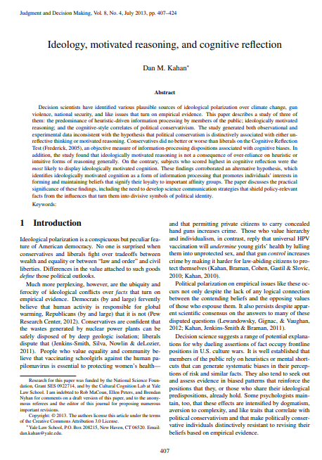 Kahan, D. M. (2013). Ideology, motivated reasoning, and cognitive reflection. Judgment and Decision making, 8(4), 407-424.