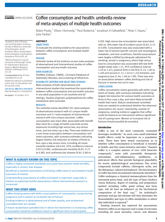 Poole, R., Kennedy, O. J., Roderick, P., Fallowfield, J. A., Hayes, P. C., & Parkes, J. (2017). Coffee consumption and health: umbrella review of meta-analyses of multiple health outcomes. bmj, 359.